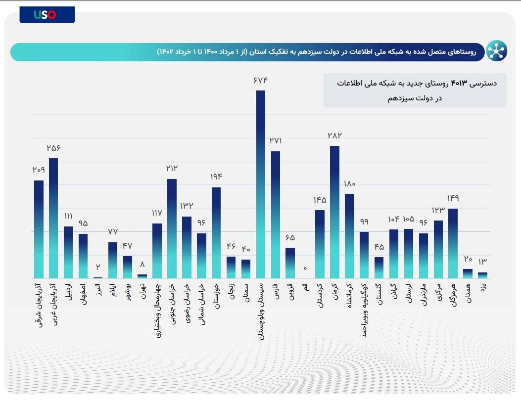 طبق آخرین آمار بهدستآمده (خرداد ۱۴۰۲) در دولت سیزدهم ۴ هزار و ۱۳ روستا به اینترنت متصل شدند. بیشترین اتصال در استان سیستان و بلوچستان انجام شده است. استانی که به دلیل وسعت جغرافیایی و پراکندگی روستاها، اتصال آن با سختی فراوانی روبهرو بود. در آستانه ۲ سالگی دولت سیزدهم اکنون ۶۷۴ روستا در استان سیستان و بلوچستان به اینترنت متصل شدهاند.