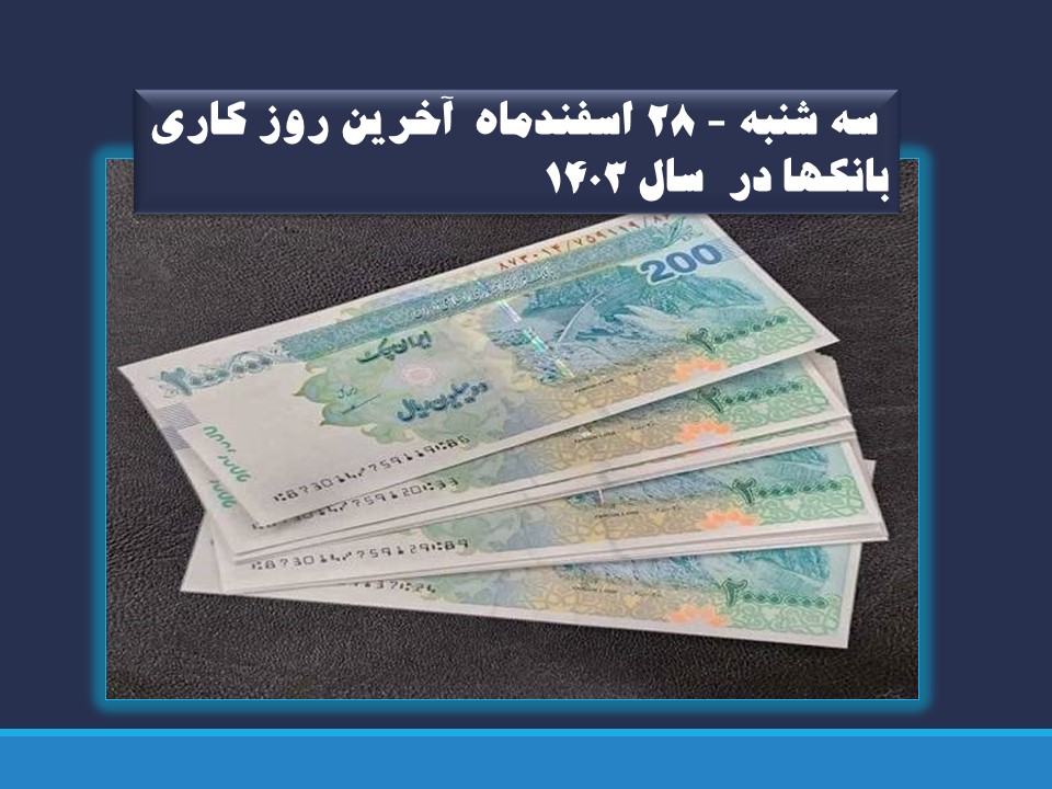 به گزارش اقتصاد و فناوری، به نقل از ایرنا: شورای هماهنگی بانک ها اعلام کرد که آخرین روز کاری سال ۱۴۰۳، سه شنبه – ۲۸ اسفندماه – خواهد بود و درباره فعالیت بانک ها در ساعت کاری روزهای کشیک ایام نوروز ۱۴۰۴ نیز از ۹ صبح الی ۱۲ ظهر تعیین شد.