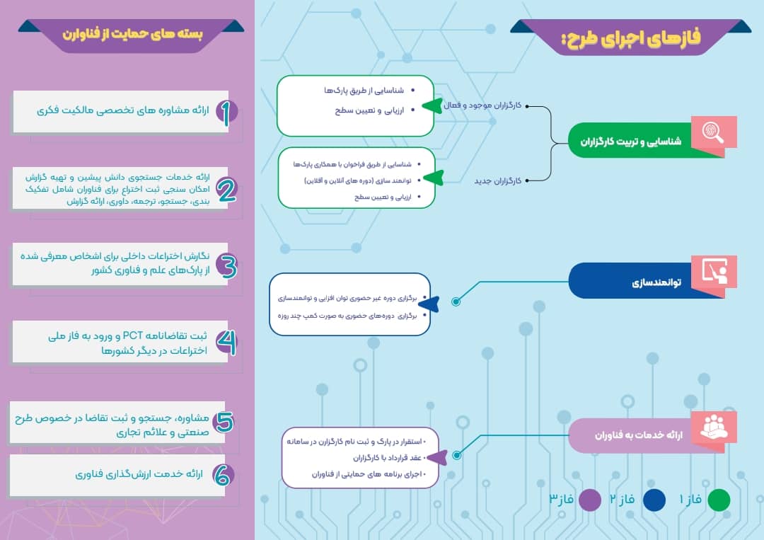 ۳. ارائه بستههای حمایتی و مشاورهای به فناوران و مخترعان پارکهای علم و فناوری سراسر کشور.