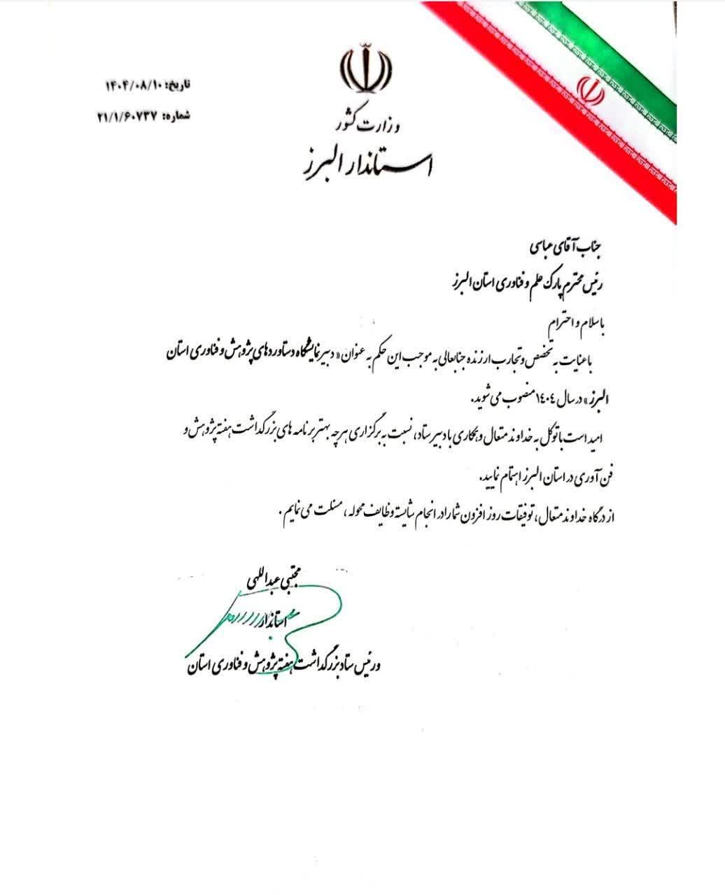«جناب آقای عباسی، رئیس محترم پارک علم و فناوری استان البرز، با عنایت به تخصص و تجارب ارزنده جنابعالی، به موجب این حکم به عنوان دبیر نمایشگاه دستاوردهای پژوهش و فناوری استان البرز در سال ۱۴۰۴ منصوب میشوید. امید است با توکل به خداوند متعال و همکاری با دبیر ستاد، نسبت به برگزاری هرچه بهتر برنامههای بزرگداشت هفته پژوهش فناوری در استان اهتمام نمایید.»