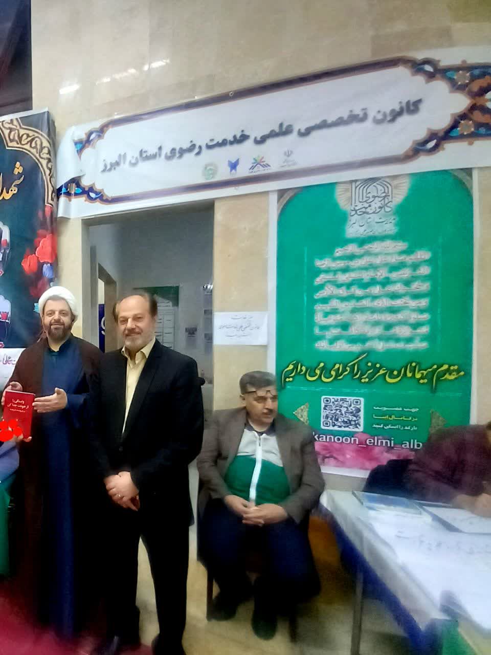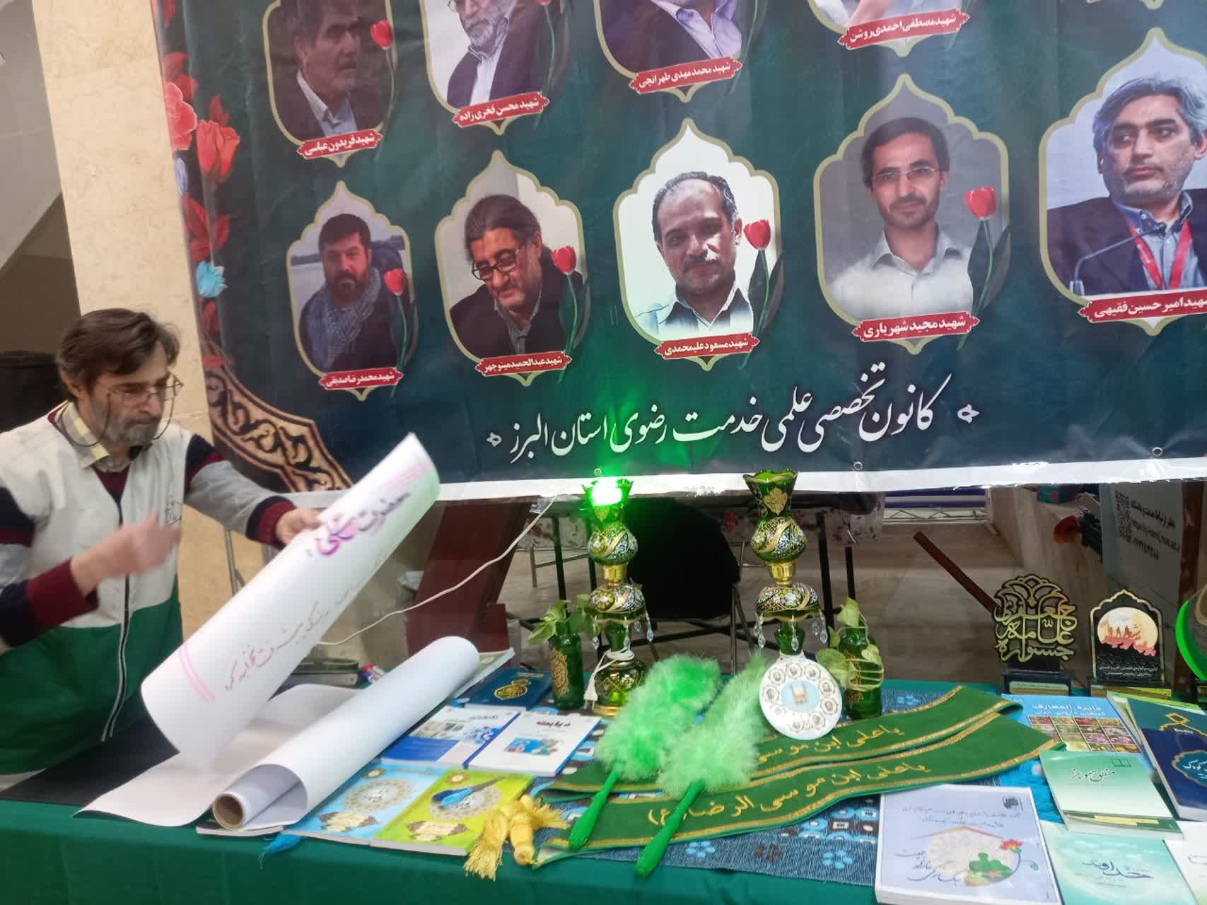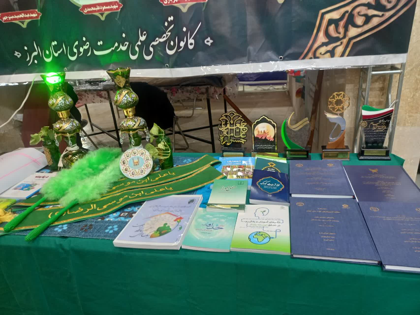 مدیر کانون تخصصی علمی خدمت رضوی درباره فعالیتهای غرفه گفت: «غرفهای که مشاهده میکنید متعلق به کانون تخصصی استان البرز است. در این غرفه مقالات، پایاننامهها، کتابها، آثار برگزیدگان جشنوارههای علمی و نویسندگان حوزه تخصصی ارائه شده و بخشی از خدمات علمی خادمیاران به نمایش گذاشته شده است. در کنار آن، میز خدمت نیز فعال است و سایر کانونها مانند حوزه هنر، عفاف و حجاب و بانوان نیز حضور دارند. هنرمندان ما در این فضا مشغول خطاطی، نقاشی و ارائه فعالیتهای هنری هستند.»