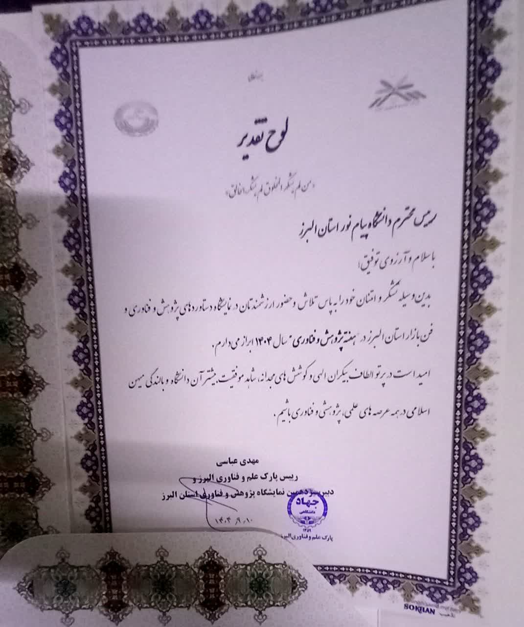 در پایان نیز مهندس مهدی عباسی رئیس پارک علم و فناوری استان البرز، به پاس مشارکت و حضور موثر دانشگاه پیام نور البرز، تقدیرنامهای به دکتر سعیدیان اهدا کرد.