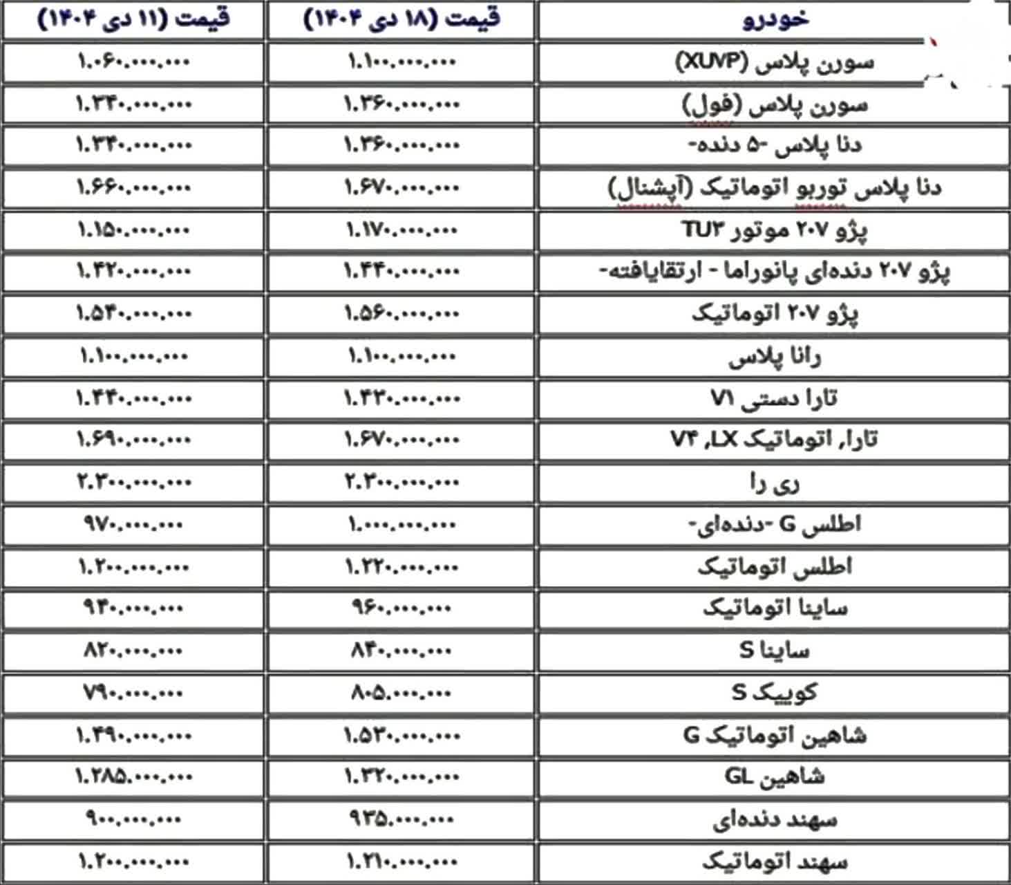 بازار خودرو در نیمه دیماه ۱۴۰۴ با موج تازهای از افزایش قیمت روبهرو شد. بررسیها نشان میدهد بیشتر محصولات ایرانخودرو و سایپا در بازه زمانی ۱۱ تا ۱۸ دی افزایش ۲۰ تا ۴۰ میلیون تومانی را تجربه کردهاند؛ در حالی که تنها چند مدل کاهش یا ثبات نرخ داشتهاند.